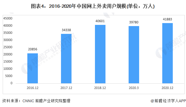 目前我国餐饮O2O行业中O2O外卖是最大的细分市场,根据CNNIC数据显示,截至2020年12月,我国网上外卖用户规模达4.19亿,较2020年3月增长2103万人,占网民整体的42.3%。