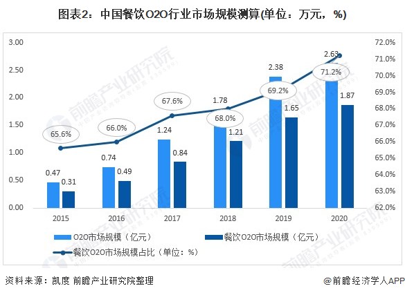 据凯度数据显示,近年来我国O2O市场增长迅速,2020年, O2O市场规模达到了2.63亿元。结合美团数据的到家O2O餐饮和到店O2O餐饮占比,2020年我国餐饮O2O市场规模接近1.87亿元。占整个O2O市场规模的71.2%。