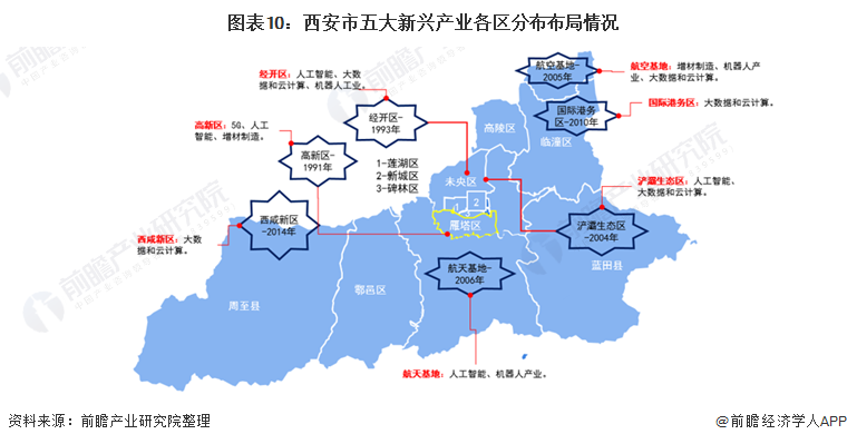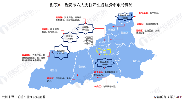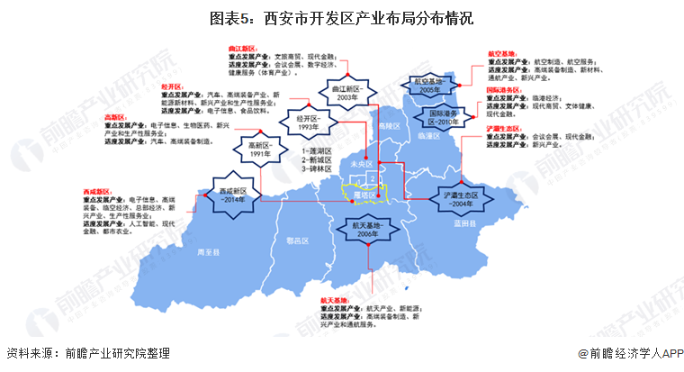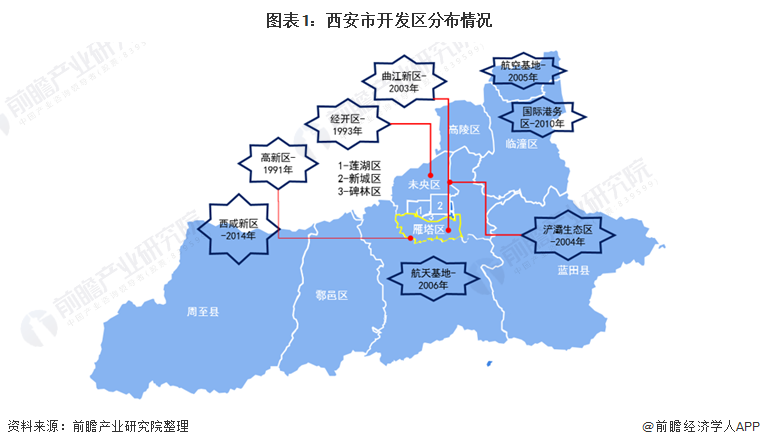 为更好促进西安市经济发展,西安市在发展过程中建设了六大开发区和两大基地,六大开发区即为高新区、经开区、曲江新区、浐灞生态区、国际港务区和西咸新区(按成立时间),两大基地即为长安区的航天基地和阎良区的航空基地。详细分布情如下: