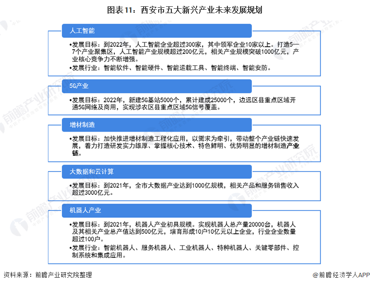 根据西安市政府2020年印发的《西安市现代产业布局规划》来看,西安市在新兴产业领域主要布局行业为5G产业、增材制造产业、大数据和云计算产业、人工智能产业和机器人产业。