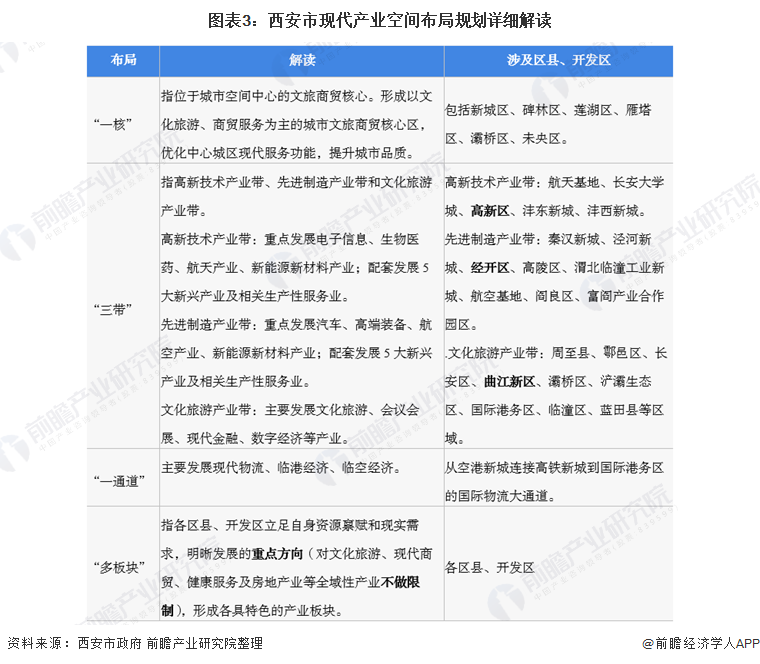 在西安市产业空间布局规划领域,西安市政府按照“地域相邻、产业相近、属性相融、优势互补、资源共享、做大做强”的原则,在空间上逐步形成“一核三带一通道多板块”的产业空间布局。“一核”指位于城市空间中心的文旅商贸核心,“三带”指高新技术产业带、先进制造产业带和文化旅游产业带,“一通道”指从空港新城连接高铁新城到国际港务区的国际物流大通道,“多板块”指各区县、开发区形成各具特色的产业板块。详细规划指标解读和产业空间分布情况如下: