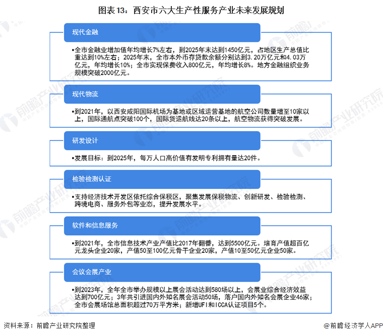 根据西安市政府2020年印发的《西安市现代产业布局规划》来看,西安市在生产性服务产业领域主要布局行业为现代金融、现代物流、研发设计、软件和信息服务、检验检测认证和会议会展行业。