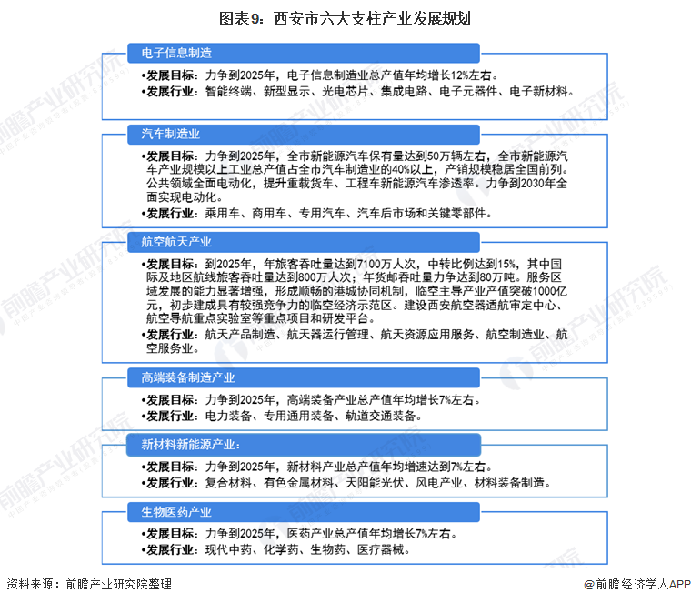 根据西安市政府2020年印发的《西安市现代产业布局规划》来看,西安市在支柱产业领域主要布局行业为电子信息制造、汽车制造、航空航天、高端装备制造、新材料新能源和生物医药。