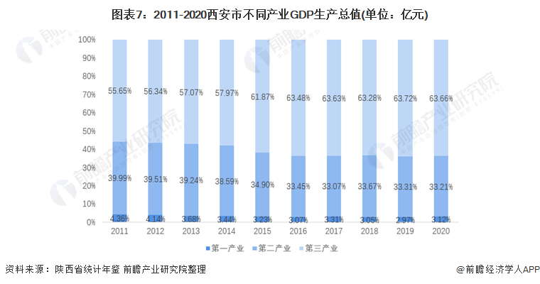 从陕西省统计年鉴公布数据来看,2011-2020年西安市第三产业生产总值呈现波动上升趋势,第一产业和第二产业生产总值占比总体呈现波动下降趋势,2020年西安市第一产业GDP占比仅为3.12%,第二产业GDP占比为33.21%,第三产业GDP占比则占63.66%。