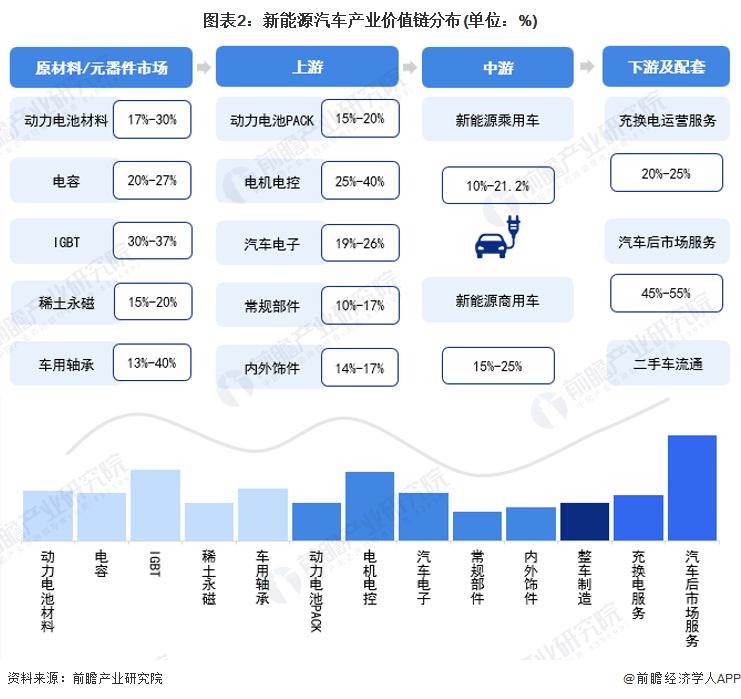 新能源汽车产业链上游为原材料和核心零部件,包括电池材料、元器件、电机电控和常规部件等等;中游是整车制造,按车辆用途写细分为新能源乘用车、新能源商用车;配套产业包括新能源汽车充换电运营服务;下游包括汽车后市场服务、电池回收等。根据新能源汽车各产业链环节的毛利率状况可知,目前,元器件-IGBT、上游电机电控及下游汽车后市场环节的利润水平相对较高,其中汽车后市场服务的代表性上市公司毛利率高达45%-55%;另一方面,上游常规部件、内外饰件等环节的毛利水平较低、附加值较低。