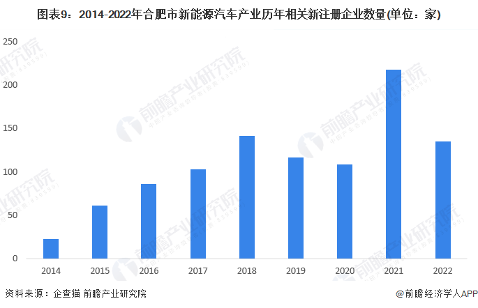 根据企查猫查询数据显示,近年来新能源汽车历年新注册企业数量呈波动性增长趋势,2021年新注册企业数量创历史高峰,达218家;2022年,合肥新能源汽车产业注册企业数量为135家,但仍然处于高位,表明合肥新能源汽车产业的发展热潮未减。