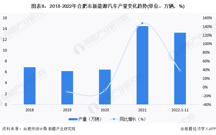 2018-2022年合肥市新能源汽车产量总体呈波动趋势,2018年新能源汽车补贴力度减弱之后,2019、2020年新能源汽车产量有所降低,2021年在国家大力推进能源转型的政策推动下,合肥市新能源汽车的年产量有所上升,为14.5万辆。2022年1-11月,新能源汽车产量为13.29万辆。