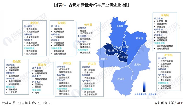在政策指引和市场需求的驱动下,合肥市新能源汽车产业链不断完善,其中,在锂电池材料、电池制造、电控电机、底盘系统、车内外饰、整车制造及配套市场环节均有企业布局:
