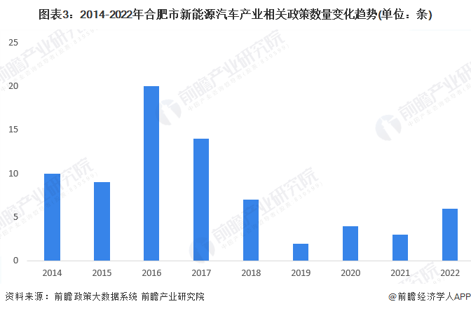 合肥市的新能源汽车相关政策主要聚焦于推广新能源汽车的应用以及新能源汽车相关配套装备的建设;2014年开始,合肥开始大力推广新能源汽车的使用,2015年,合肥提出建立新能源汽车产业集群,并在2020、2021、2022年再次提出新能源汽车产业集群的建设,未来,预计合肥市新能源汽车产业的重点将朝着产业集群平台搭建、产业集群之间技术共享以及相关配套监管政策更加完善发展。2022年,合肥市共有6条相关政策公布。总体来看,近年来,合肥市新能源汽车产业相关引导政策较少。