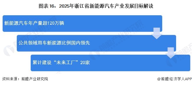 根据《浙江省新能源汽车产业发展“十四五”规划(2021-2025年)》,到2025年,产业集群化发展布局更加优化,产业规模和竞争力位居国内前列。全省新能源汽车年产量超120万辆,占全省汽车生产总量比重超过60%,新能源汽车产量占全国比重10%左右,关键零部件本地配套率显著提升;公共领域用车新能源比例国内领先,率先开展自动驾驶汽车规模化商业应用,充换电服务便利性显著提高;建设新能源汽车产业大脑,累计建设“未来工厂”20家,培育形成“十百千”创新型骨干企业梯队,产业数字化转型和绿色化发展走在全国前列。