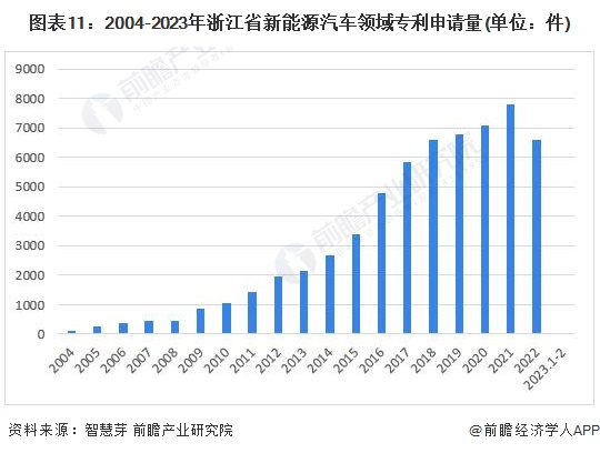浙江省十分注重新能源汽车技术创新,研发能力持续提高。根据智慧芽查询数据显示,自2015年起,浙江省新能源汽车领域专利申请量快速增长,2015-2022年历年专利申请量均突破3000件。截至2023年2月,浙江省新能源汽车领域累计专利申请了突破6万件,位居全国榜首,整体上看,浙江省新能源汽车产业研发能力位居全国前列,优质的创新环境为新能源汽车产业发展提供了有力的支撑。