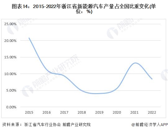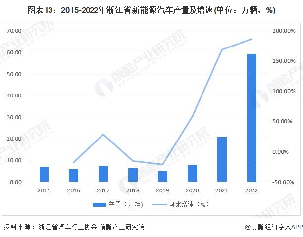 浙江省新能源汽车产业发展迅猛,新能源汽车产量快速攀升。根据浙江省汽车行业协会的数据显示,2021年,浙江省全年共生产新能源汽车20.70万辆,同比增长168.83%;2022年,浙江省累计生产新能源汽车59.26万辆,同比增长186.28%,新能源汽车产量增速屡创新高,占全国新能源汽车产量比重达8.40%。