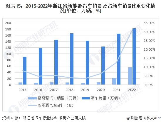 浙江省作为全国新能源汽车应用推广先行示范区域,新能源汽车销量消费习惯培养效果显著,新能源汽车销量常年位居全国前列,新能源汽车销量占新车销量比重持续提高。根据浙江省汽车行业协会公布的数据显示,2021年浙江省新能源汽车销量达20.92万辆,占新车销售量比重达12.66%。2022年,浙江省新能源汽车销量再创新高,全年累计销售新能源汽车55.93万辆,占新车销量比重突破25%,达30.76%。