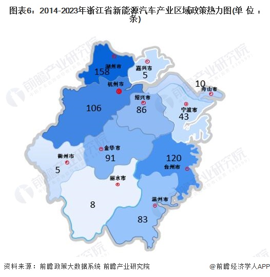 除省级产业政策外,浙江省下辖11个地级市也通过出台相关产业发展政策,助推地区新能源汽车产业发展。从浙江省11个地级市2014年至今发布的新能源汽车产业相关政策数量来看,杭州市、湖州市和台州市发布的新能源汽车产业相关政策数量较多,在政策支持引导下,杭州市成为浙江省新能源汽车产业发展高地,在新能源汽车制造、产业链建设和市场应用推广方面均走在全国前列。