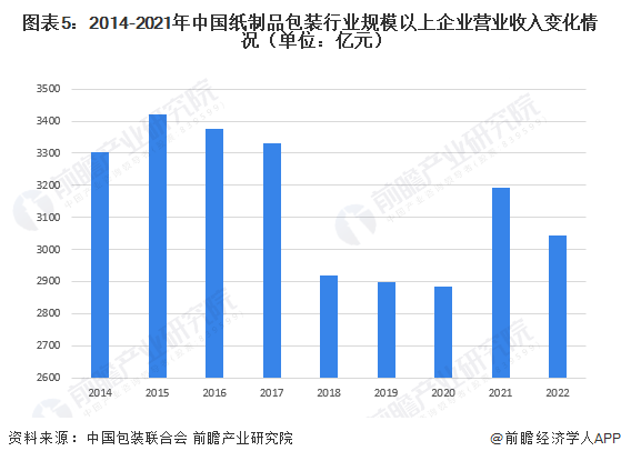 近年来,随着我国纸制品包装行业产业结构调整的深入,我国纸制品包装行业规模呈现下降趋势。据中国包装联合会统计数据显示,2014年以来,我国纸制品包装行业规模以上企业主营业务收入随着规模以上企业数量的增长反而呈现下行走势。但伴随着“限塑令”的政策推动,纸制品包装行业自2021年起实现了较大突破,2022年,我国纸制品包装行业规模以上企业主营业务收入3045.47亿元,同比下降5.01%,