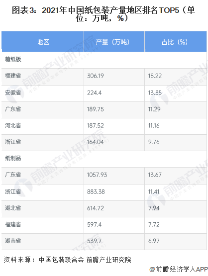 福建省箱纸板产量最高,广东省纸制品产量最高