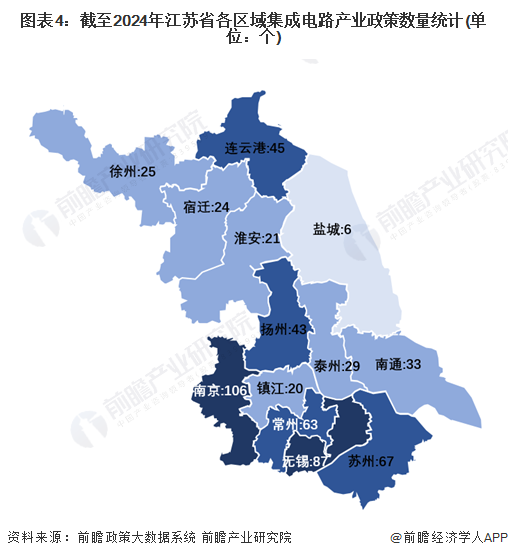 截至2024年7月12日,南京与无锡集成电路产业政策最多,分别为106个与87个;盐城集成电路产业政策较少,仅为6个。