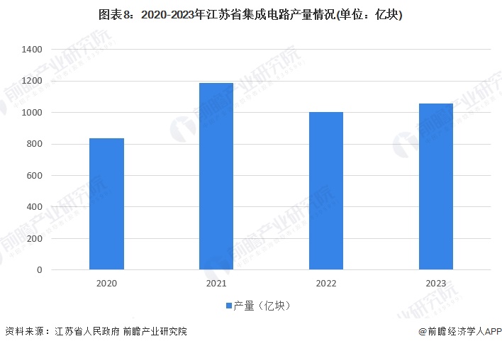 从江苏省集成电路产量情况来看,2020-2023年江苏省集成电路产量呈现波动变化,2023年产量为1054.9亿块,同比增长5.02%。