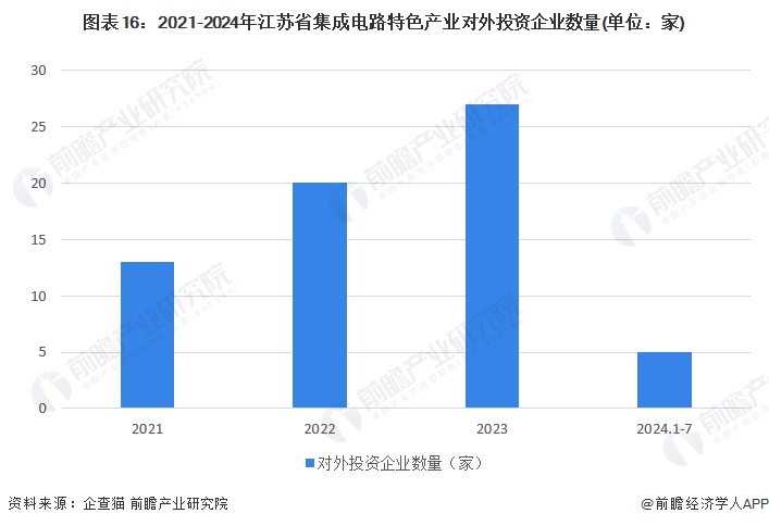 截至2024年7月12日,江苏省集成电路产业暂无迁入企业,对外投资企业为68家,其中65家企业披露了对外投资日期。2023年,江苏省集成电路特色产业对外投资企业最多,为27家。2024年1-7月,江苏省集成电路特色产业对外投资企业为5家。