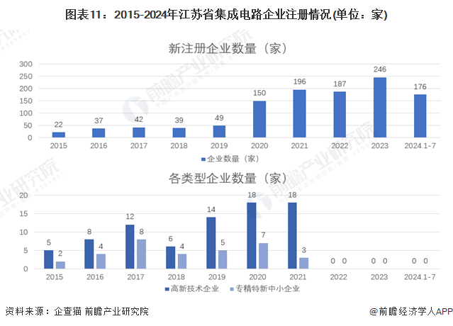 截至2024年7月12日,江苏省集成电路共有企业数量1650家,其中高新技术企业241家,专精特新中小企业113家。2015-2023年,江苏省集成电路新注册企业数量呈现波动上升趋势,2023年新注册企业数量为246家,2024年1-7月新注册企业数量为176家。