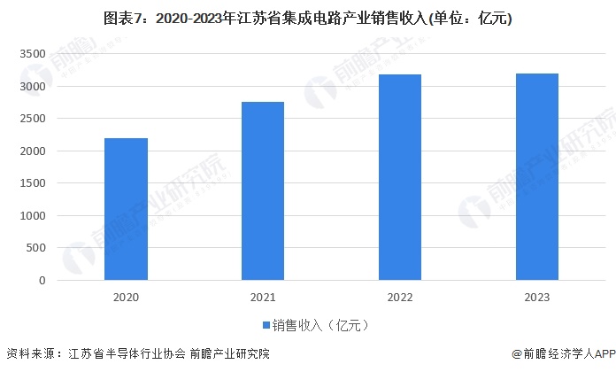 从江苏省集成电路产业销售收入来看,根据江苏省半导体行业协会披露的信息,2020-2023年,江苏省集成电路产业销售收入呈现逐年增长趋势,2023年江苏省集成电路产业销售收入为3200亿元。江苏集成电路产业规模全国领先,且集聚效应显著。