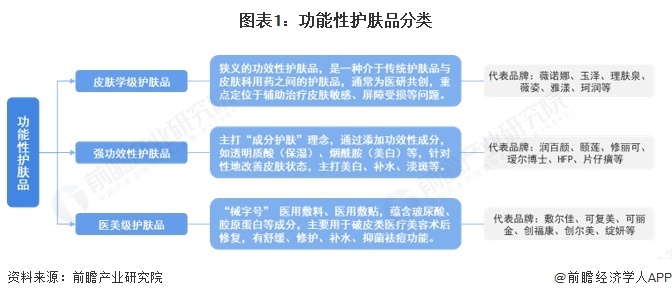 功能性护肤品指针对性地缓解或辅助治疗某些皮肤问题的一类化妆品(妆字号)或医疗器械(械字号),具备一定药理作用,行业正处于国产品牌崛起阶段。根据护肤品功能及功效的不同,功能性护肤品可分为皮肤学级护肤品、强功效性护肤品和医美级护肤品。