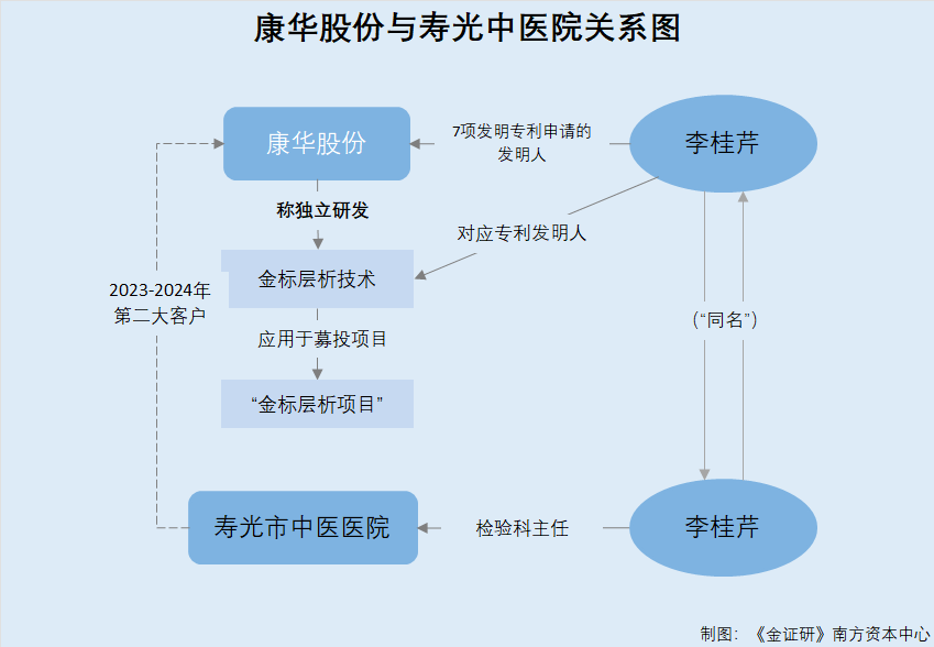 换言之,寿光市中医医院作为康华股份2023-2024年的第二大客户,其检验科主任李桂芹,与康华股份多项发明专利申请的发明人“重名”,其中申请日期最早出现在2021年1月,而2022年1月康华股份开始上市辅导。其中的专利还包括核心技术专利金标层析技术对应的专利,而康华股份称该核心技术为自主研发、原始创新。