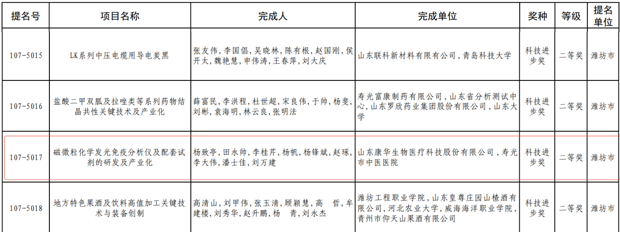 据山东省科学技术厅于2024年7月9日发布的2024年度山东省科学技术奖受理项目公示,项目“磁微粒化学发光免疫分析仪及配套试剂的研发及产业化”的完成单位为康华股份及寿光市中医医院,完成人为杨致亭、田永帅、李桂芹、杨帆、杨锋斌、赵琢、李大伟、潘士佳、刘万建。