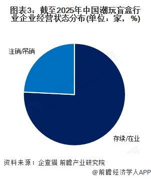 根据企查猫查询数据显示,从注册企业经营状态来看,截至2025年8月,中国潮玩盲盒行业的存续/在业企业1.9万家,占总企业数的76%;注销/吊销企业数量6千余家,占总企业数的24%。总体上看,中国潮玩盲盒行业企业经营情况良好,在业/存续企业数量占比相对较高。