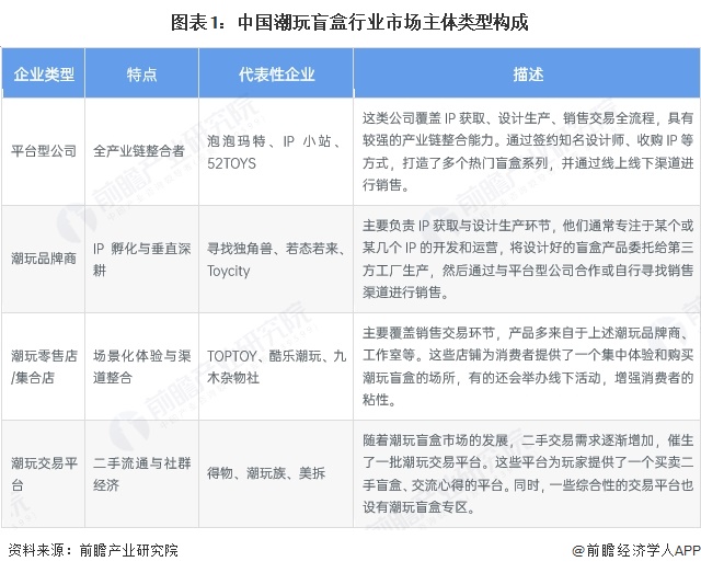中国潮玩盲盒行业由平台型公司、潮玩品牌商、潮玩零售店/集合店、潮玩交易平台四类主体构成,它们分工明确又协同联动,共同形成从IP诞生、产品落地到消费流通的完整生态。