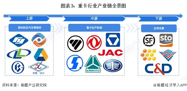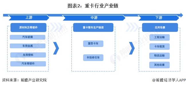 重卡行业产业链上游包括汽车玻璃、车用金属、车用塑料以及汽车零部件等,中游为重卡整车生产制造,下游为重卡产品应用场景,包括工程运输、卡车租赁、物流运输等。