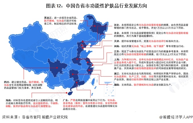 基于此,中国各省市也提出功能性护肤品行业发展方向,主要集中于支持功能性原料产业发展,规范医疗器械、化妆品生产监管,加强化妆品功效宣称依据监管,规范化妆品网络销售宣传行为等方面。