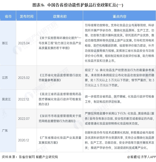 除了国家层面的支持政策外,浙江、江苏、广东、上海等各省市政府也积极出台多项政策,在功能性原料、化妆品功效宣称依据、化妆品网络直播宣传规范等方面进一步支持功能性护肤品行业的发展。