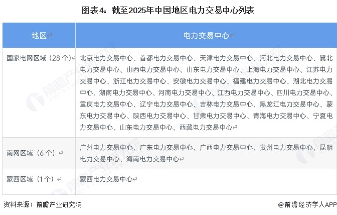 截至2025年,全国共建有35个电力交易中心,包括北京、广州两个区域电力交易中心和33个省(区、市)电力交易中心。除内蒙古电力交易中心(蒙西电力交易中心)是由内蒙古国资委控制外,其余电力交易中心分别隶属于国家电网和南方电网公司。其中,国家电网控制28个,南方电网控制6个。