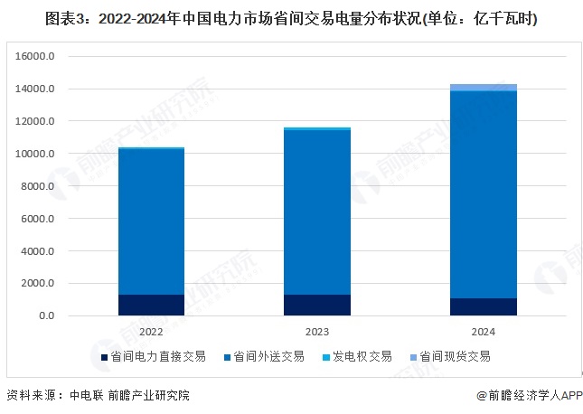 2024年,省间交易电量合计为14267.9亿千瓦时,其中省间电力直接交易1052.4亿千瓦时、省间外送交易12778.7亿千瓦时、发电权交易56.1亿千瓦时、省间现货交易380.7亿千瓦时。