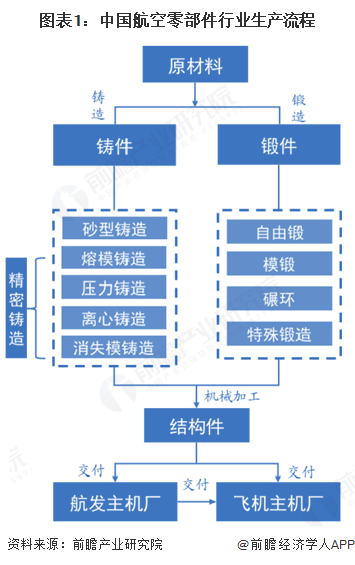 锻铸工艺是航空零部件生产的主要工艺。锻铸是传统的,也是最基础的金属成形工艺。锻铸工艺是工业化的基石,也是高端技术产品创新发展的根本保障。在航空航天领域,从通用零部件到专用零部件,锻铸工艺贯穿整个航空航天零部件生产过程。锻造工艺性能好,用于负载高、工作条件严峻,但结构复杂性要求相对不高的零件。锻压是利用锻压对金属坯料施加压力,使其产生塑性变形以获得具有一定机械性能、一定形状和尺寸锻件的加工方法。锻造可以分为热锻、温锻和冷锻。也可以按照成形机理,分为自由锻、模锻、碾环和特殊锻造等。对于结构较为复杂的零部件,不适合采用锻造工艺。铸造工艺适用性和应用范围广,可以用于具备复杂结构及内腔的零部件。铸造是将液体金属浇铸到与零件形状相适应的铸造空腔中,待其冷却凝固后,获得零件及毛坯的方法。通过铸造可以生产形状复杂的零部件,尤其是具有复杂腔体的毛坯。