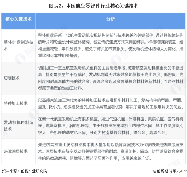 航空零部件核心技术包括整体叶盘制造技术、切削技术、特种加工技术、发动机机匣制造技术、热障涂层技术、航空发动机零部件的无损检测技术等。