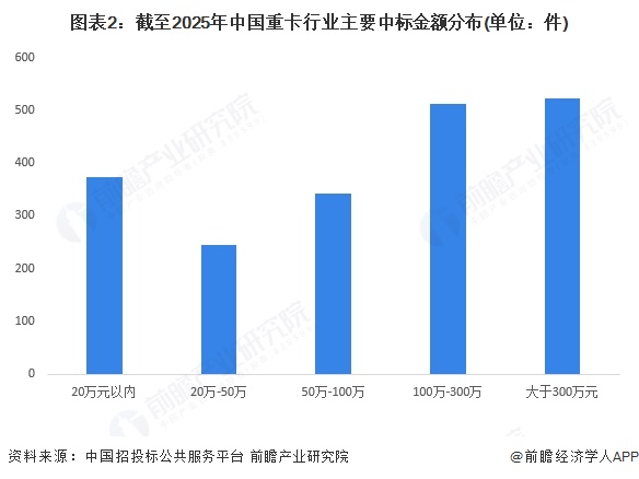 2、中国重卡行业中标金额分布主要在100-300万元以内