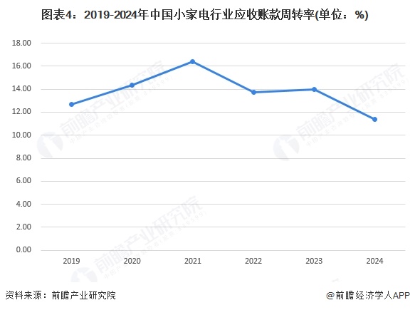 2019-2024年中国小家电行业应收账款周转率呈现先升后降的波动趋势。2019-2021年,受“宅经济”推动,市场需求旺盛,企业产品销售顺畅,资金回笼加快,同时线下线上渠道拓展顺利,经销商回款及时,使得应收账款周转率持续攀升,2021年达到峰值16.40。2022年,随着“宅经济”效应减弱,市场需求放缓,企业为维持销量可能放宽信用政策,增加赊销比例,加上部分经销商资金周转压力增大,回款速度变慢,导致周转率降至13.71。2024年,全球经济复苏乏力,海外市场需求波动,国内消费信心不足,企业面临更激烈的市场竞争,为抢占市场份额进一步放宽赊销条件,同时部分海外客户付款周期延长,叠加国内经销商库存压力下回款能力下降,使得应收账款周转率降至11.36,反映出行业资金回收效率在后期面临较大挑战。