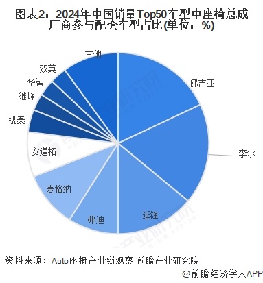 根据Auto座椅产业链观察披露的信息,2024年我国销量Top50车型中座椅总成厂商参与配套车型占比如下图所示,其中佛吉亚占比18%、李尔占比18%、延锋占比14%、弗迪占比9%。