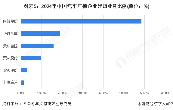 从代表性企业出海业务比例对比情况来看,继峰股份重视出海业务程度较高,其出海业务收入占比高达58.58%,华域汽车排名第二,国外业务占比19.1%。