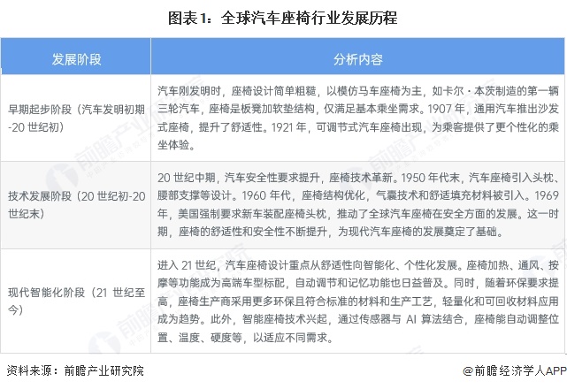全球汽车座椅行业发展可以分为早期起步阶段、技术发展阶段和现代智能化阶段。早期(汽车发明至20世纪初)设计简陋,从马车座椅演变而来,后出现沙发式及可调节座椅;20世纪初中期至末为技术发展阶段,头枕、气囊等安全设计及舒适填充材料引入,安全性和舒适性提升;21世纪至今进入现代智能化阶段,功能向智能化、个性化发展,环保材料应用成趋势,智能座椅通过传感与AI适配需求。