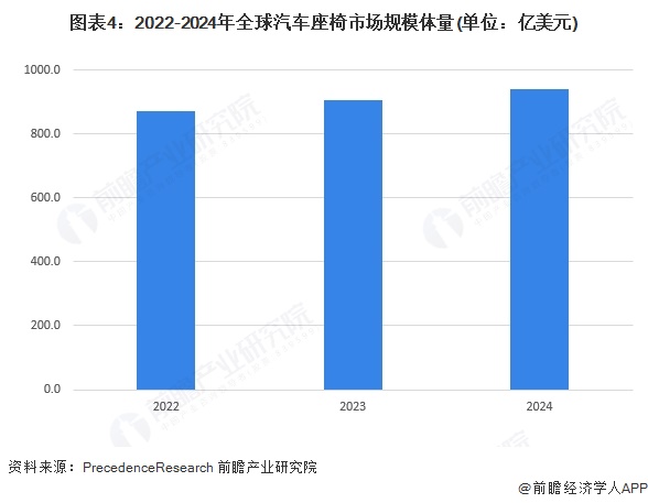 根据PrecedenceResearch披露的信息,全球汽车座椅市场规模整体呈现增长趋势,2024年全球汽车座椅市场规模估计为941亿美元,该市场增长的主要原因是汽车行业的崛起以及主要参与者之间为提供最大舒适度而加剧的竞争。