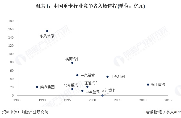 从代表性企业入场进程来看,陕汽集团、东风公司入场较早,于1995年之前成立;大多数企业在1995-2000年间成立,福田汽车、一汽解放、江淮汽车等企业均成立于这一时期。从注册资本情况来看,东风汽车企业的注册资本较高,其注册资本超过150亿元,福田汽车等注册资本约80亿元。其余竞争者注册资本在20-50亿元区间内。