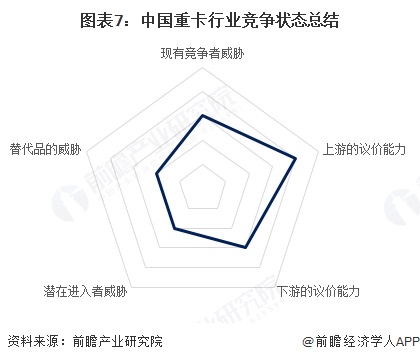 从五力竞争模型角度分析,目前,我国重卡行业供给企业较为稳定,行业重资本低毛利,存在较高的行业壁垒,潜在竞争者进入市场难度大;上游重卡核心零部件供应商具备较强的议价能力;在下游议价方面,个体及自然人议价能力较弱,大型企业议价能力较强。