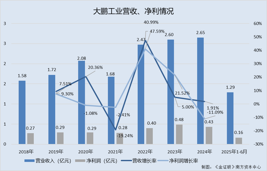 据大鹏工业签署于2025年9月2日的招股说明书(以下简称“签署于2025年9月2日招股书”)、签署于2023年11月8日招股说明书(以下简称“签署于2023年11月8日招股书”)、签署于2021年6月25日首次公开发行股票并在创业板上市招股说明书(以下简称“创业板招股书”)及2025年半年度报告,2018-2024年,大鹏工业的营业收入分别为1.58亿元、1.72亿元、2.08亿元、1.68亿元、2.47亿元、2.6亿元、2.65亿元。