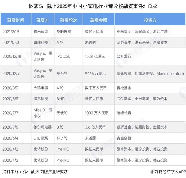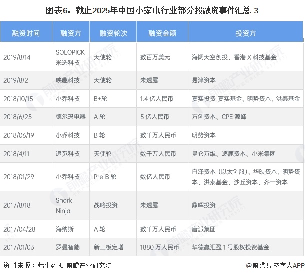 截止2025年8月,中国小家电行业投融资情况如下所示: