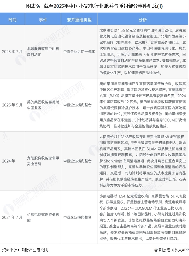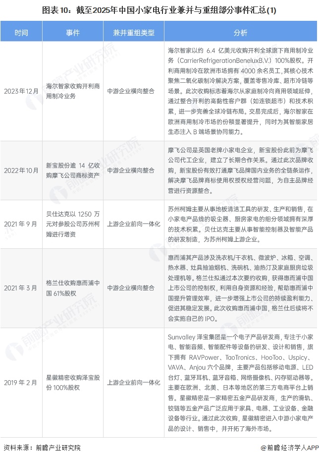 目前中国小家电行业的兼并重组事件减少,目前兼并重组的类型包括中游企业横向整合、上游企业前向一体化。