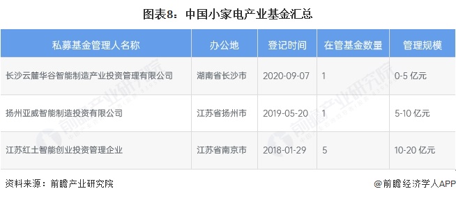 目前小家电行业的产业投资基金比较少,目前在中国证券投资基金业协会中仅查询到相关产业基金3家,主要均为智能制造领域的投资公司,在管基金数量较少,管理规模在0-20亿元之间。