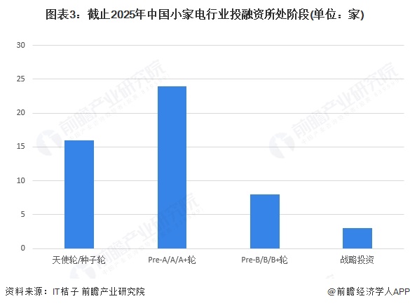 截止2025年8月,中国小家电行业公司当前投融资轮次处在Pre-A/A/A+轮阶段的企业较多,其次是处在天使轮/种子轮企业。